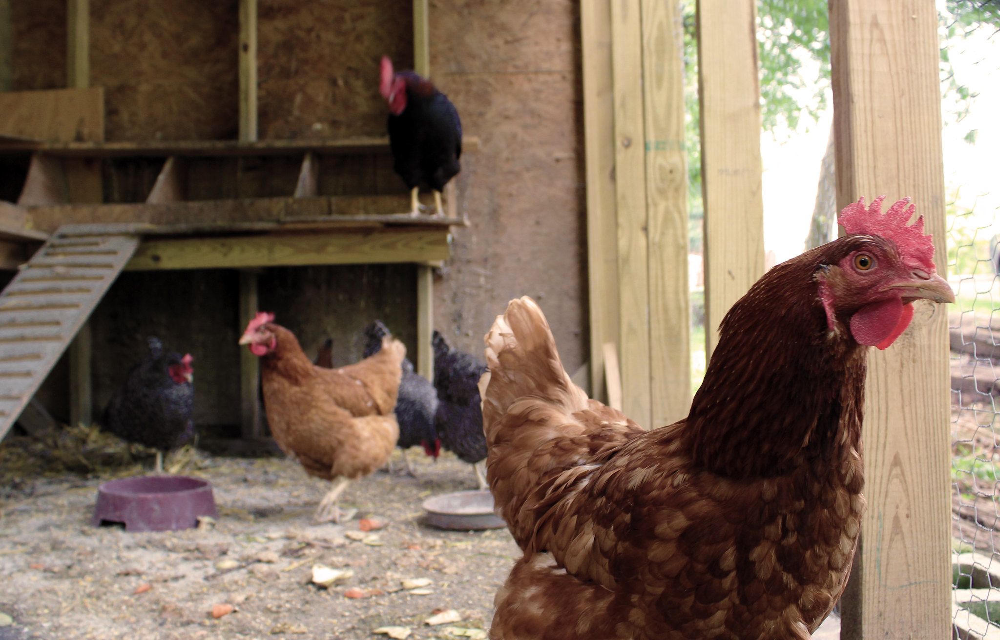 The area I can see has just been cleaned of our waste, and our human is just changing the litter in our coop.4 I give him a thankful cluck!